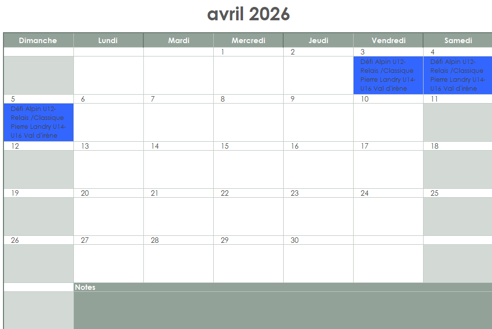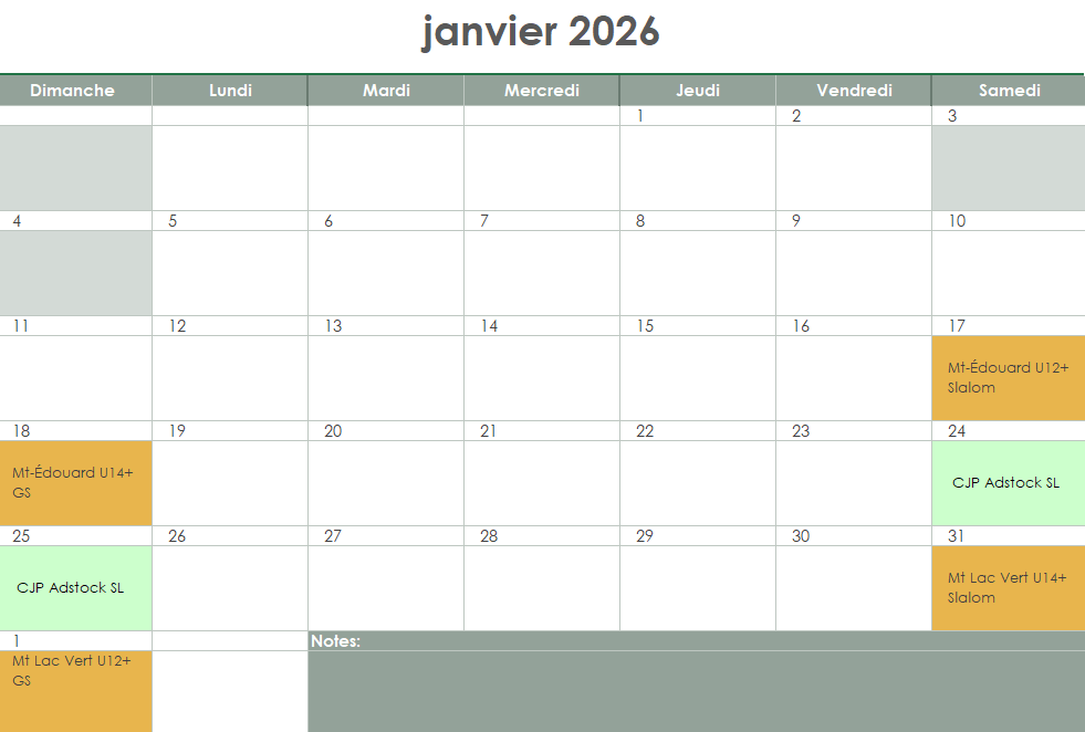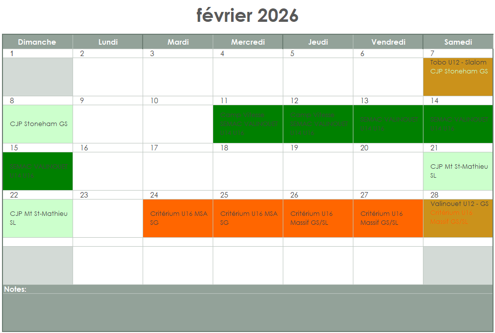 Calendrier des entrainements U8-U18